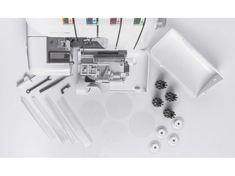 Husqvarna Viking Amber S100 je 4/3/2nitný overlock s 16 různými stehy, které vám pomohou dokončit jakýkoli projekt. Levý i pravý přední kryt se dají otevřít, což umožní úplný přístup k prostoru kličkařů, což velmi usnadňuje navlékání nití. Díky diferenciálnímu podávání získáte dokonale rovné švy - nedochází k natahování a deformaci úpletů ani ke krabatění jemnějších látek a lze jej použít i pro nabírání.