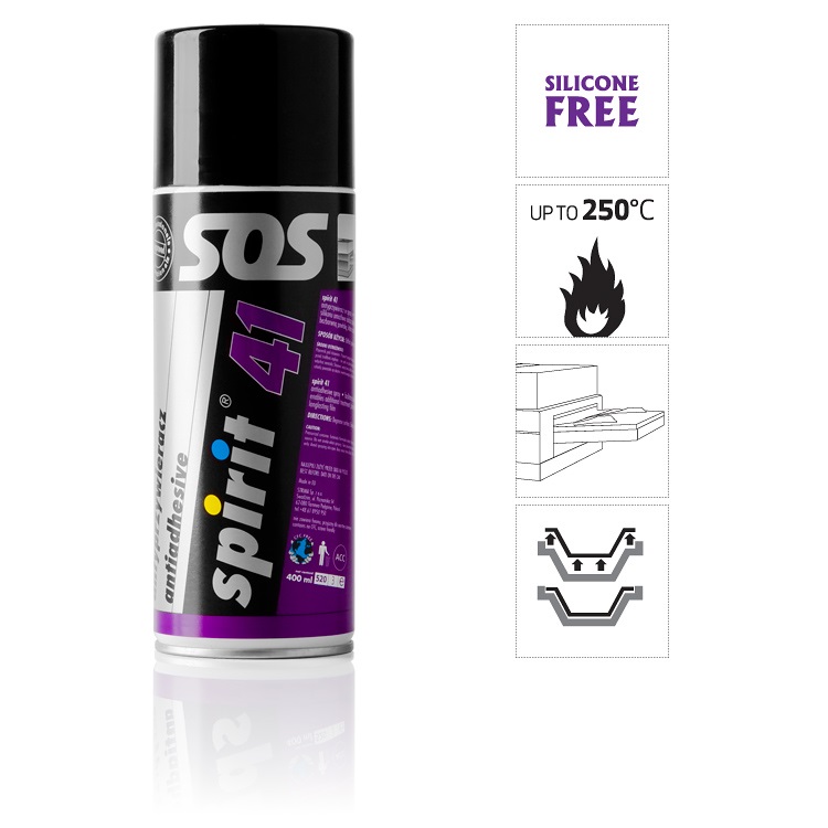 Spirit 41 je sprej proti proti přilnavosti. Jeho složení neobsahuje silikon a vytváří tak úpravu vhodnou k následnému lepení, malování atd. Je odolný proti teplotám až do 250°C.