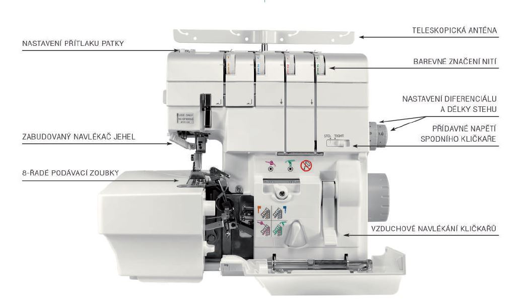 8řadý podavač - jedinečný systémKaždý zákazník ví, že nejdůležitější je systém podávání. Díky 8řadému podavači je materiál podáván pod patkou rovnoměrně a posun je dokonalý jak pro lehké a delikátní materiály tak pro těžké materiály. Přenastavení je otázkou chvilky.