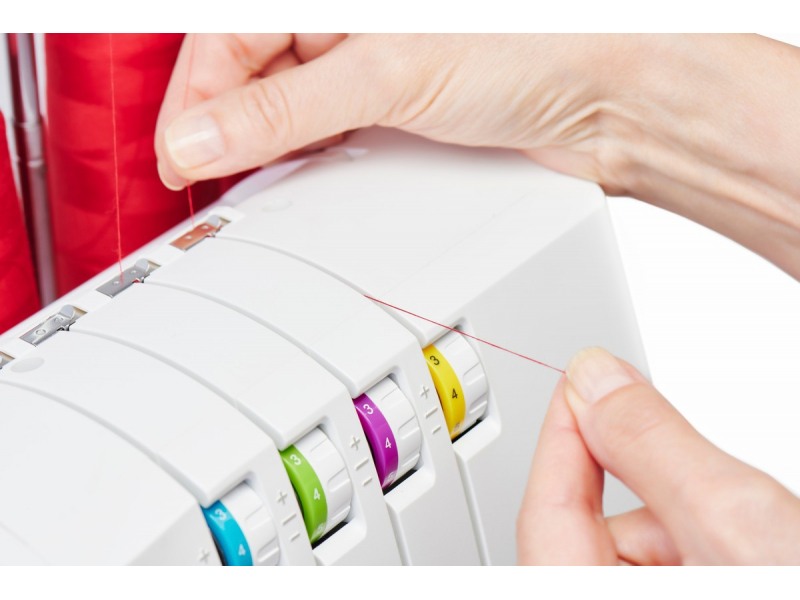 Rychlé a snadné navlékání - stačí pouze následovat barevné schéma. Každá cesta nitě má svoji specifickou barvu pro lehkou identifikaci. Jednoduše navlékněte nit podle barevného schématu.