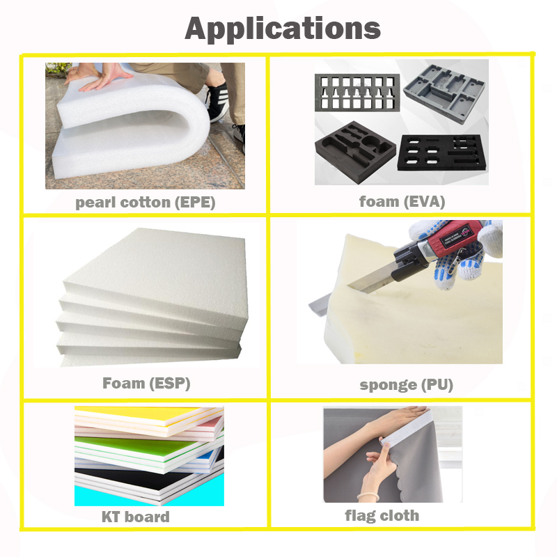 Řezy molitanové pěny, polystyrenu s lehkostí, vlastní tvar a design, pěna (ESP), pěna (EVA), perleťová bavlna (EPE), pěna stavební (PU), izolační deska (XPS), polypropylen (EPP), KT deska, netkaná textilie, záclonová tkanina, textilní vlajková tkanina, chemická vláknitá tkanina, kůže, plast, akryl, nylonové lano, popruhy, tapety, pásy atd.