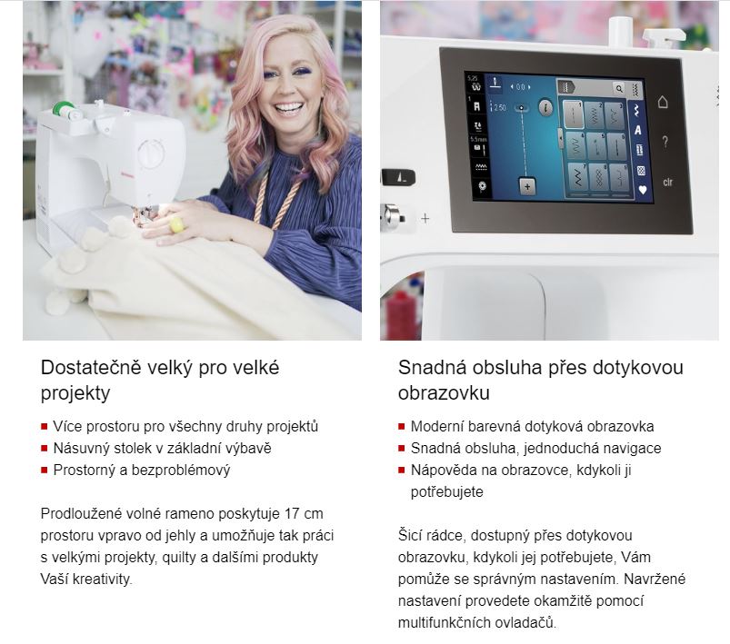 - velká barevná dotyková obrazovka: informuje o délce a šířce stehu, přítlaku patky, polohy podavače a jehly atd.