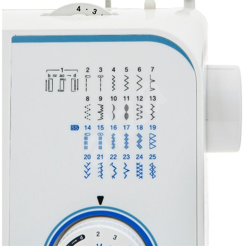 Šicí stroj má 25 programů včetně knoflíkové dírky šité na 4 kroky, volně nastavitelná délka stehů, pevně dané cik-cak stehy, zpátkování pomocí páčky, šití dvojjehlou, volné rameno, LED osvětlení