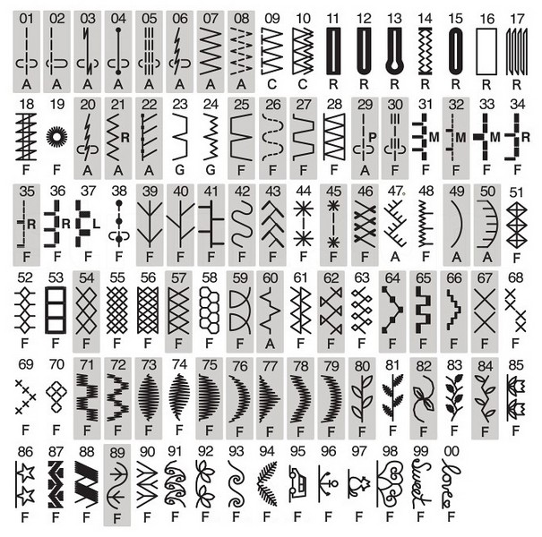 100 šicích programů: stehy základní, elastické (strečové), overlockové a plastické vyšívací, speciální stehy pro quiltování a patchwork a mnoho dalších stehů.