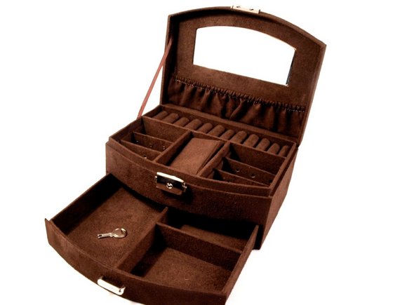 Tato 2 patrová šperkovnice má ve spodní části 3 oddělení, vhodné na hodinky a náramky. Ve vrchní části najdete zrcadlo a různě velké přihrádky na řetízky, prstýnky nebo přívěsky (45x190mm, 2 přihrádky 65x85mm, 50x90mm). Je celokoženková a prošitá, na spodní zásuvce jsou úchytky ke snadnému vytažení, 3 oddělení 85x130mm, 60x90mm a 65x90mm, celá je vypolstrovaná umělým semišem. Součástí je klíček k bezpečnému uzamčení. Shora je praktické ucho na přenášení.